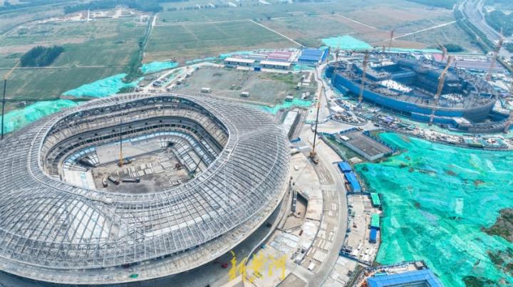 5月23日,在济南市凤凰黄河大桥西侧、黄河北侧正在建设的济南黄河体育中心,巨大的6万人专业足球场、体育馆、游泳馆及全民健身中心项目正在同步施工建设,“一场两馆一中心”雏形已显。