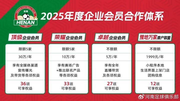 5月24日,河南足球俱乐部2025年度企业会员合作体系正式发布,有4个档次的会员可以参与。