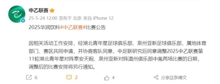 5月24日,中乙联赛官方发布公告,原计划5月26日16:00泰安天贶客场对阵湖北青年星的比赛延期,具体比赛日期并未明确。