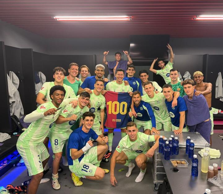 在与毕尔巴鄂竞技的西甲收官战中,莱万上演梅开二度,达成巴萨生涯百球里程碑,赛后,莱万在社交媒体晒出他举着百球纪念球衣与队友们的合影。