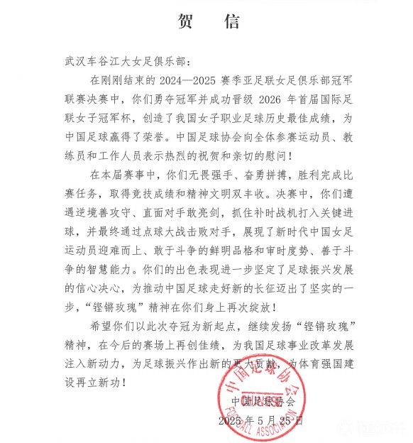在刚刚结束的2024—2025赛季亚足联女足俱乐部冠军联赛决赛中,你们勇夺冠军并成功晋级2026年首届国际足联女子冠军杯,创造了我国女子职业足球历史最佳成绩,为中国足球赢得了荣誉。中国足球协会向全体参赛运动员、教练员和工作人员表示热烈的祝贺和亲切的慰问!