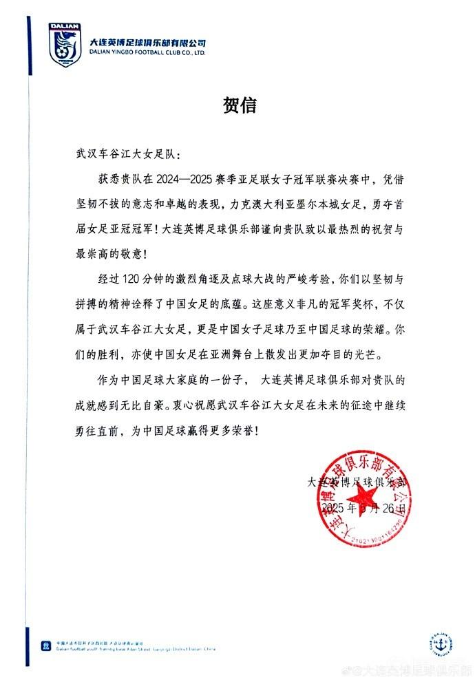 在本月24日,武汉车谷江大女足历经点球6-5战胜墨尔本城女足夺得首届女足亚冠冠军。今日,大连英博足球俱乐部送上贺信。