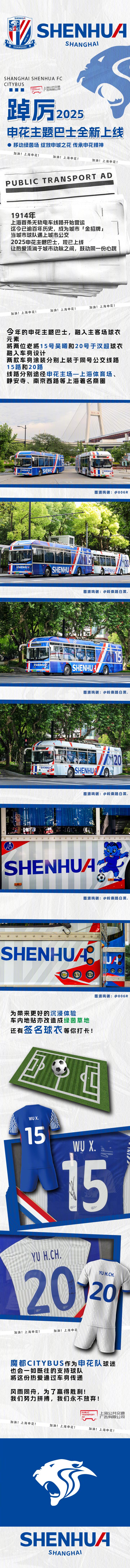今年的申花主题巴士,融入主客场球衣元素,将两位老将15号吴曦和20号于汉超球衣融入车身设计,两款车身涂装分别上装于同号公交线路15路和20路,线路分别途径申花主场一上海体育场、静安寺、南京西路等上海著名商圈。