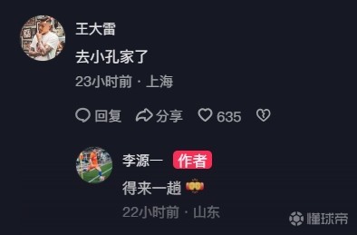 在这条动态的评论区里,俱乐部队友王大雷留言:“去小孔家了。”随后,李源一回复道:“得来一趟。”