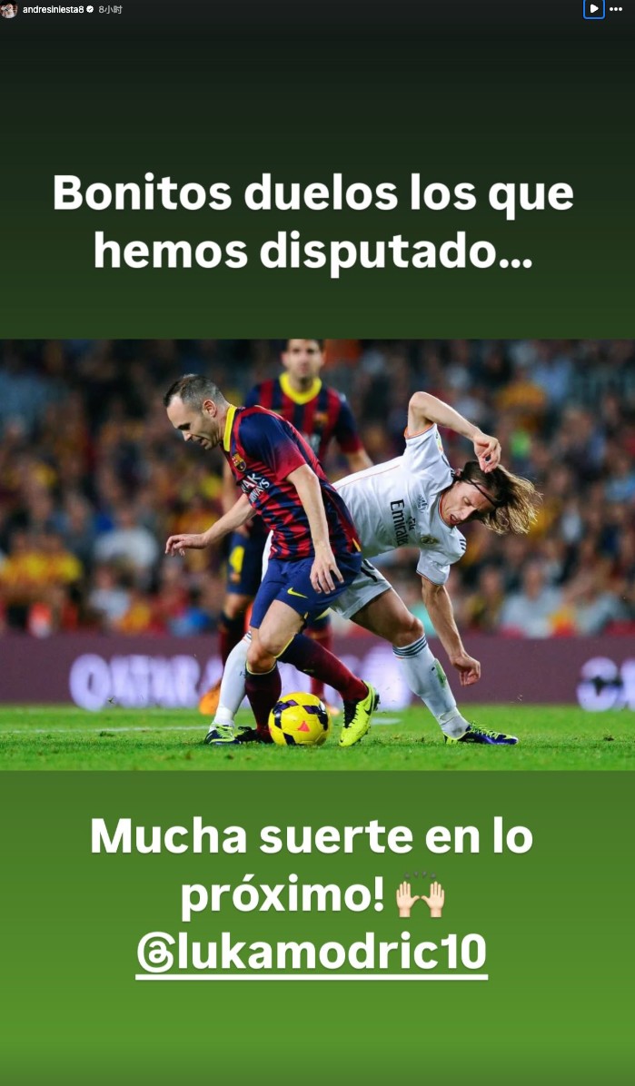 在莫德里奇确认将于今夏离开效力多年的皇马后,巴萨传奇伊涅斯塔在社交媒体送上祝福。