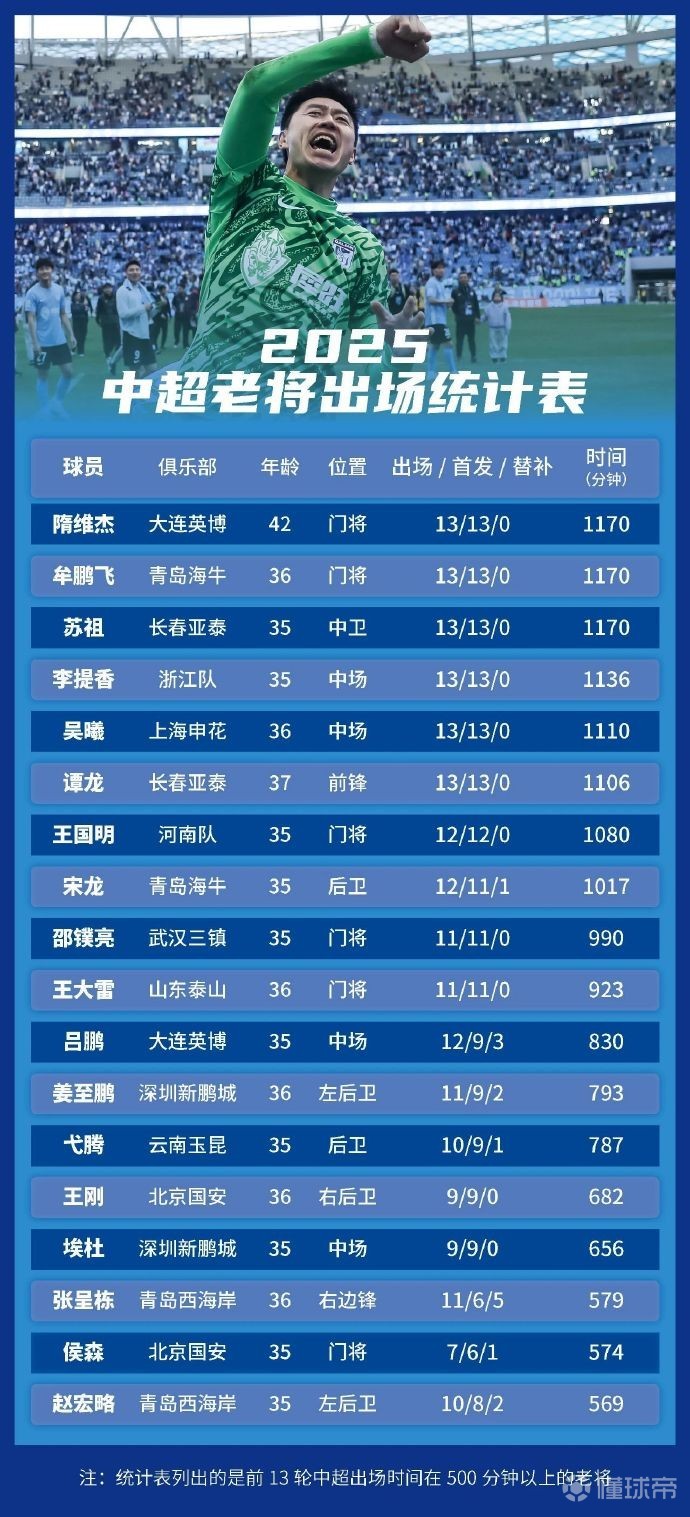 20名“35岁+”老将前13轮出场时间不足500分钟。吕文君(上海海港)、尹鸿博(河南队)、郑龙(青岛海牛)、杨贺(云南玉昆)、阎相闯(大连英博)5人出场时间低于100分钟,冯卓毅(成都蓉城)、石笑天、陈柏良(青岛西海岸)、刘君(青岛海牛)、耿晓峰(云南玉昆)5人没有得到任何出场时间。