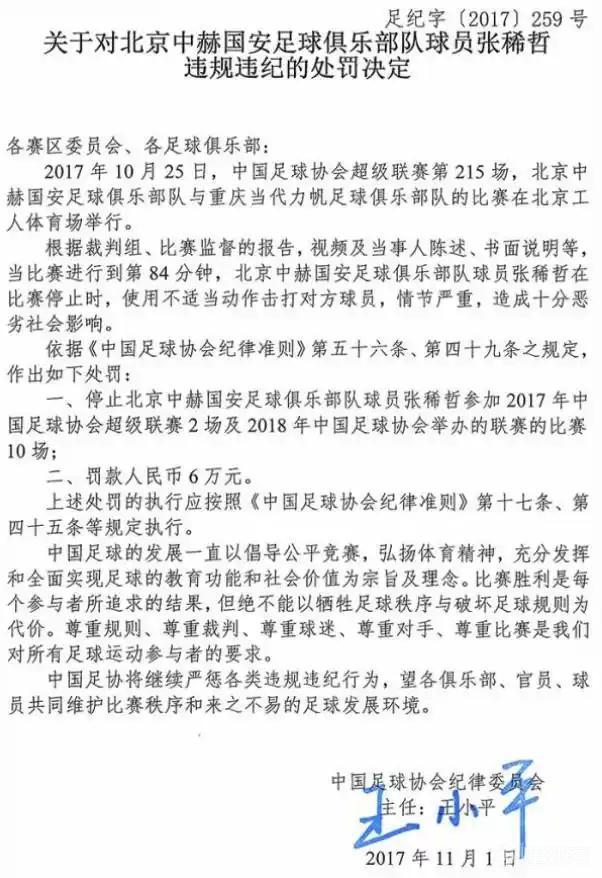还是回到标题上来吧。有一次参加年度颁奖会议,足协纪律委员会主任王小平和我聊天儿,他问我,你对处罚张稀哲十二场比赛有什么看法?因为不久前刚刚做出判罚决定,作为足协纪律委员会的主任,他肯定是希望我赞同他的处罚。我说张稀哲的行为肯定是不对的,但是十二场的判罚确实是罕见的,我觉得判六场更适合一些。