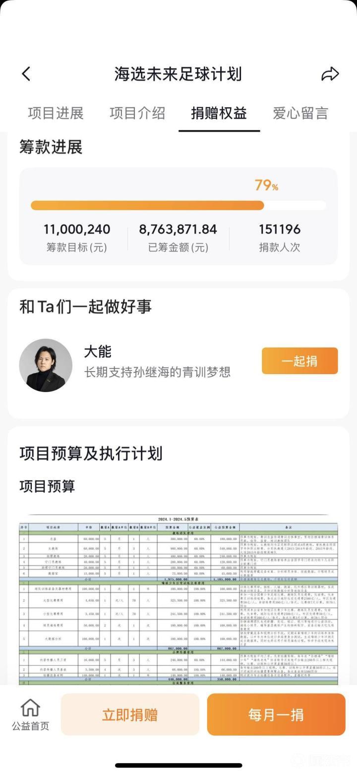 据《扬子晚报》报道,目前孙继海在平台为“嗨球”青训募集公益资金,已有15.1万人捐赠超过800万元。该项目预算表显示,球队有4名主教练,每人税前月薪6万元。