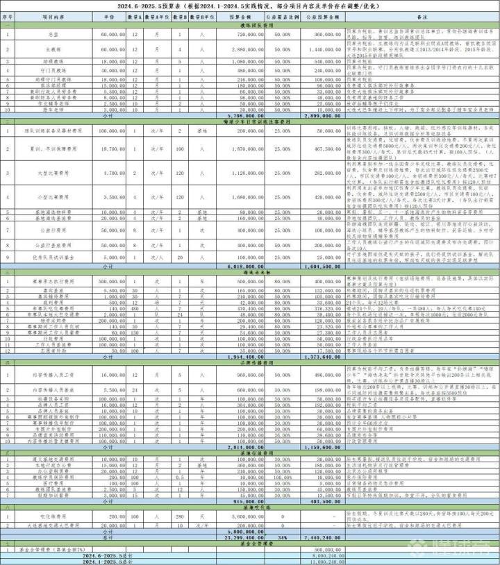 教练团队预算(含总监、助理教练、守门员教练等):600万元(公益预算承担300万元)