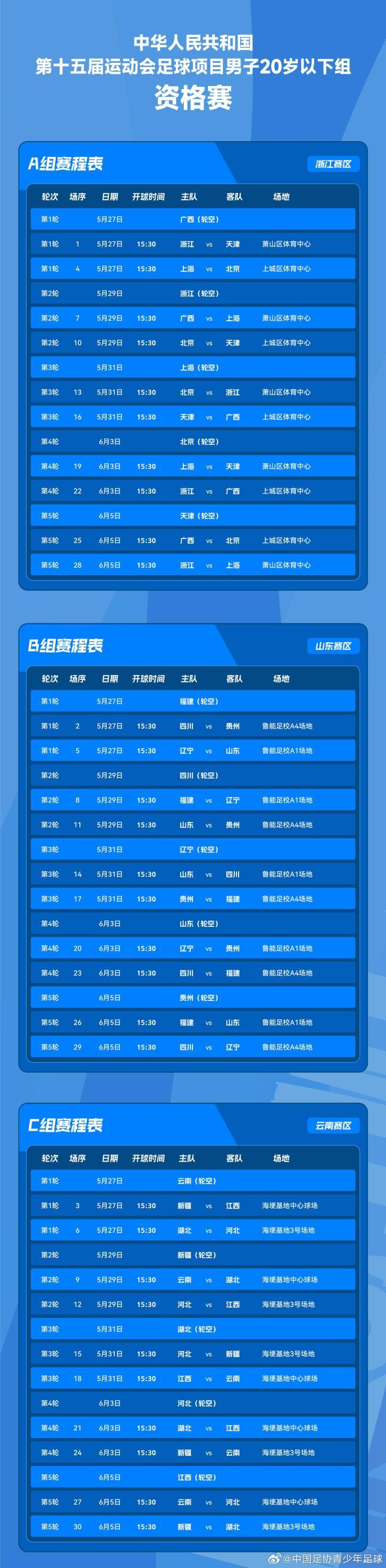 北京时间5月27日下午,中华人民共和国第十五届运动会足球项目男子20岁以下组资格赛的6场比赛开打,其中上海、山东与新疆等队分别战胜了对手。