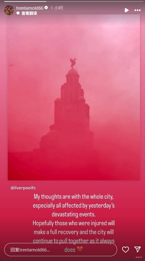 北京时间5月27日,阿诺德在社交媒体上发表动态,为受害者祈福:“我的心与整个城市同在,特别是所有在昨天毁灭性事件中受到影响的人们。”