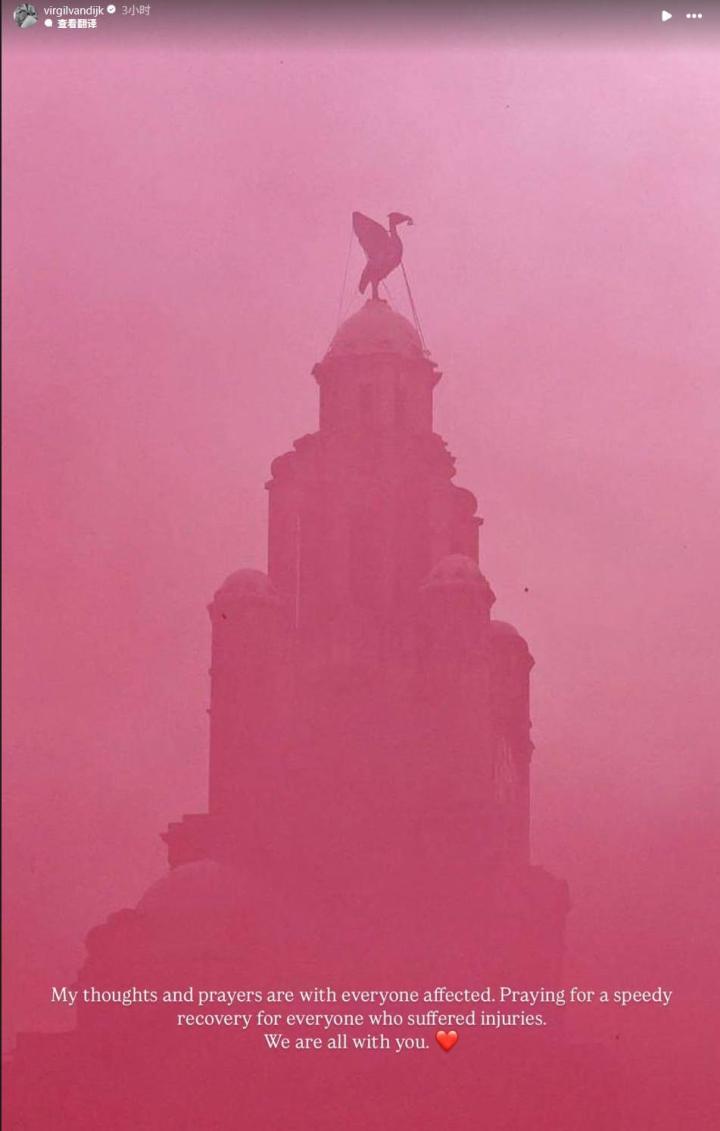 北京时间5月27日,范戴克在社交媒体上发表动态,为受害者祈福:“我的心与受到影响的每一个人同在。祈祷所有受伤的人能够早日康复,我们与你们同在。”
