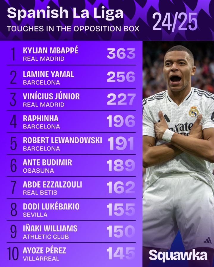 据统计,皇家马德里的姆巴佩是本赛季西甲联赛在对方禁区内触球次数最多的球员。