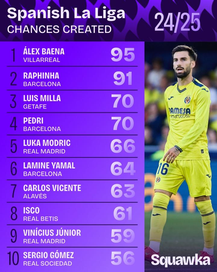 据统计,比利亚雷亚尔的巴埃纳是本赛季西甲联赛创造机会次数最多的球员。