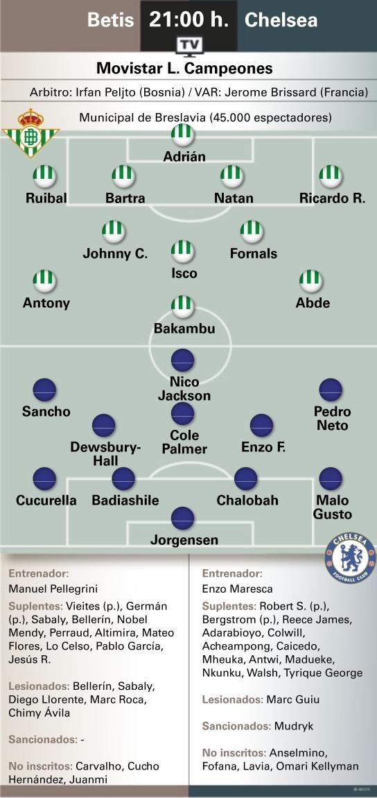 在这套阵容中,贝蒂斯除了中场大将洛塞尔索外主力尽遣,而切尔西这边除了帕尔默、雅克松、恩佐、库库雷利亚、内托等常规主力外,在欧协联一直是常规主力的霍尔和巴迪亚西勒也进入到了预测首发当中。