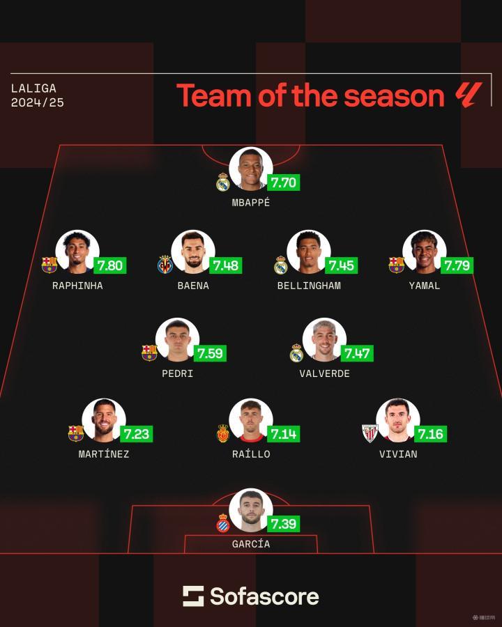 北京时间5月28日,知名足球数据平台Sofascore发布了本赛季西甲联赛最佳阵容,巴萨有四名球员入选,皇马紧随其后,有三名球员入选,西班牙人、毕尔巴鄂竞技、马略卡和比利亚雷亚尔均有球员入选,四名U23球员入选最佳阵容。