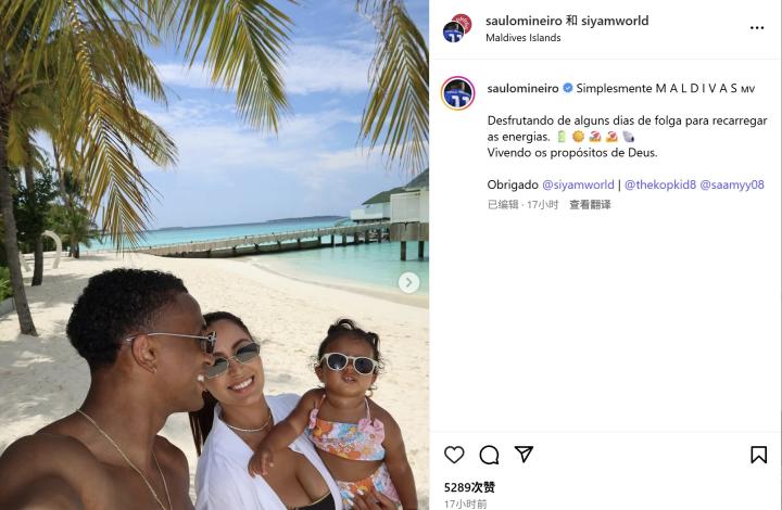 北京时间5月28日,申花外援米内罗更新社媒,晒出全家在马尔代夫游玩的照片。