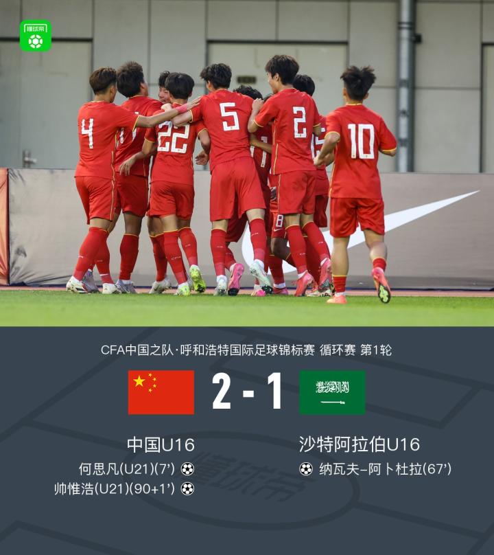 U16国少2-1绝杀沙特U16,帅惟浩、何思凡分别建功,谢晋助攻