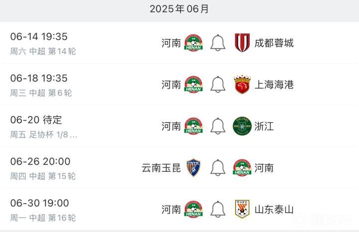 中超联赛将于6月14日重启,河南队先要主场迎战争冠集团的成都蓉城。6月18日,完成对阵上海海港的补赛。紧接着,就是足协杯比赛。河南队可以与浙江队进行商议,在6月20日至22日之间选择比赛日。高温天气下,9天时间内打3场比赛,堪称“魔鬼赛程”,所幸都是主场作战,免去了舟车劳顿。