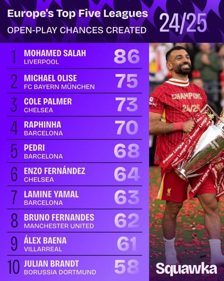 北京时间5月29日,数据网站Squawka公布了2024-25赛季欧洲五大联赛运动战创造机会次数最多的十名球员,其中萨拉赫位居榜首,奥利塞和帕尔默分列二三。
