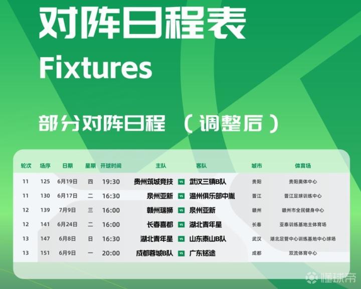 北京时间5月30日,中乙官方发布比赛公告,联赛第11至13轮6场比赛调整后的日期确定。
