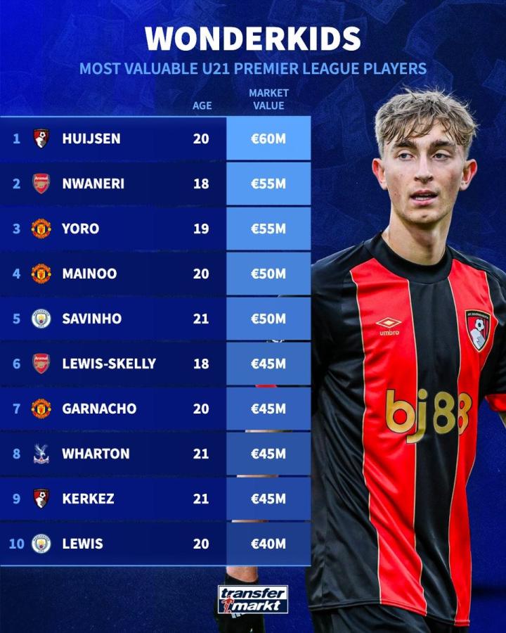 在榜单中,阿森纳前锋恩瓦内里和曼联后卫约罗均以5500万欧元身价并列第二位。梅努、加纳乔、刘易斯-斯凯利、里科-刘易斯等也悉数在列。榜单具体如下: