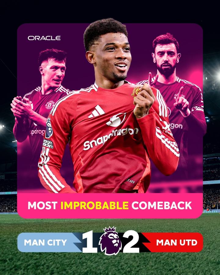 本赛季英超第16轮,曼联在0-1落后的局面下,在第88分钟以及第91分钟连入两球,完成对同城死敌的逆转,最终获得了那场比赛的胜利。