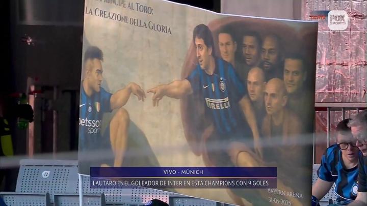 慕尼黑安联球场看台上的国米球迷展示出了一幅奇妙的画作,画的左侧是他们的队长劳塔罗-马丁内斯,而右侧则是以2010年欧冠决赛梅开二度的迭戈-米利托为首的一众国米名宿。