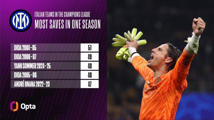 欧冠决赛,国际米兰将对阵巴黎圣日耳曼,国米门将索默本赛季欧冠已奉献48次扑救,距离有统计以来单赛季欧冠扑救次数纪录仅差3次。