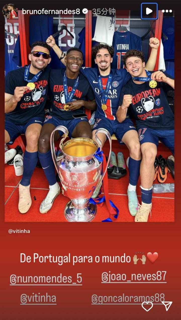 在巴黎圣日耳曼夺得2024-25赛季欧冠冠军后,曼联中场布鲁诺-费尔南德斯为巴黎阵中的葡萄牙国家队队友们送上祝贺。