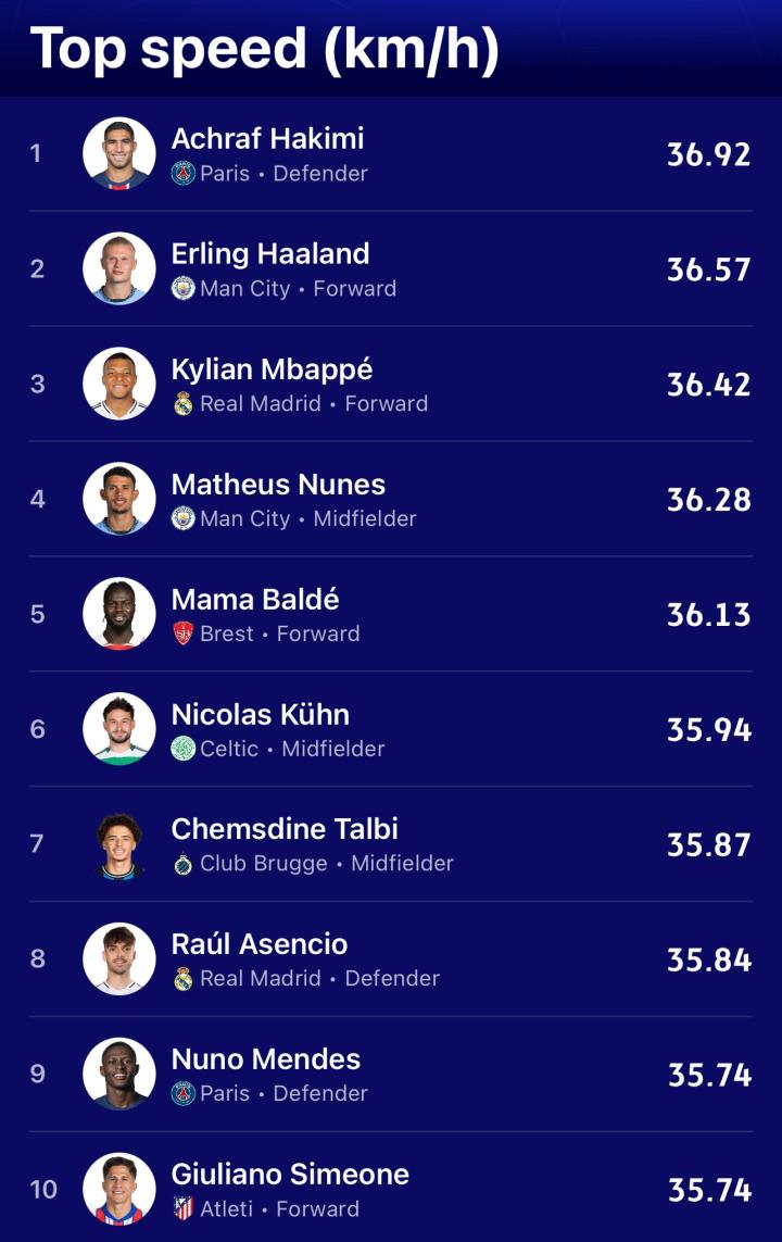 北京时间6月2日,随着24/25赛季欧冠落下帷幕,欧足联官方统计了本次欧冠联赛中速度最快的球员排行榜,阿什拉夫以36.92Km/h排行第一,哈兰德排行第二。