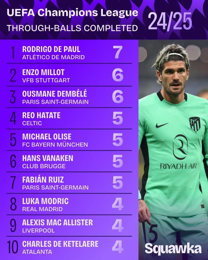 北京时间6月2日,2024-25赛季欧冠落幕。在本赛季欧冠完成直塞榜上,马德里竞技中场德保罗完成7次直塞位居榜首,巴黎圣日耳曼的奥斯曼-登贝莱完成6次直塞排名第二。