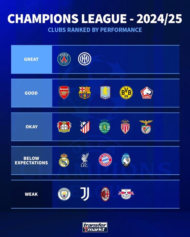 北京时间6月3日,本赛季欧冠联赛已经尘埃落定,德国转会市场针对各支球队欧冠中的表现进行了排位定档,其中两支欧冠决赛球队表现最佳,曼城、尤文等球队表现差劲。