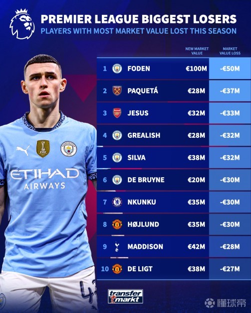 北京时间6月3日,德国转会市场列出了在本次身价更新后,英超各球员的身价下跌榜。其中,在身价下降最多的前十名球员中,曼城球员独占四席。