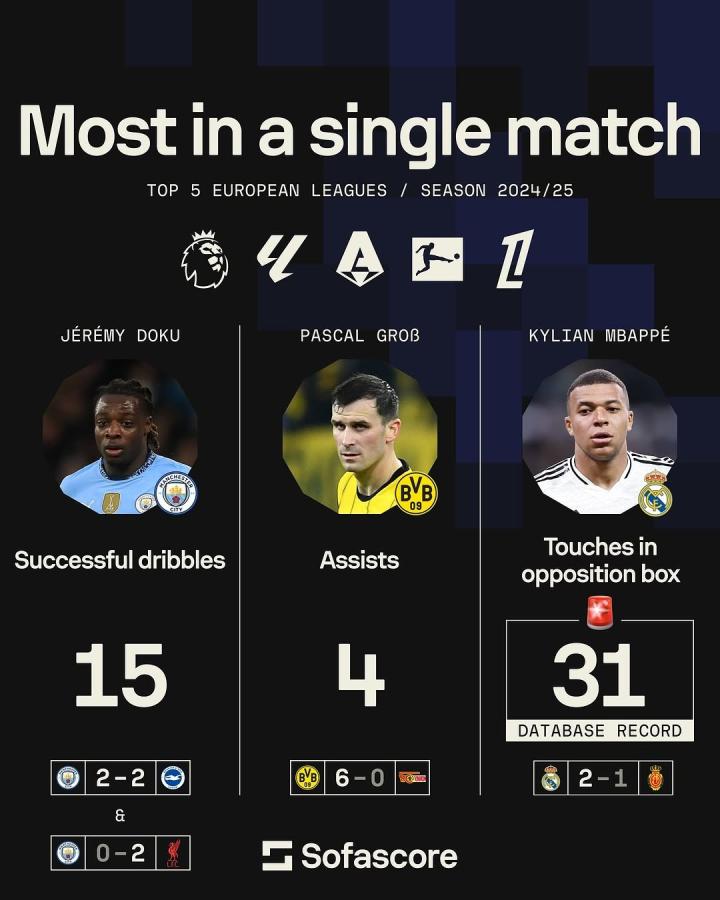 北京时间6月4日,数据机构Sofascore汇总了2024/25赛季五大联赛中各项单场纪录的最高值,多名球员凭借单场出色表现登上榜单。其中,多库两场比赛均完成15次成功过人、格罗斯单场送出4次助攻、姆巴佩单场对方禁区触球31次,均为本赛季五大联赛单场之最。