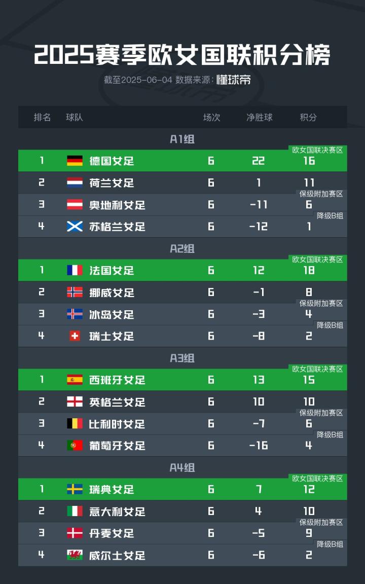 北京时间6月4日,随着欧洲女子国家联赛小组赛阶段全部结束,2025赛季四强球队正式出炉。德国、法国、西班牙和瑞典从各自小组中脱颖而出,成功晋级本届欧女国联半决赛。