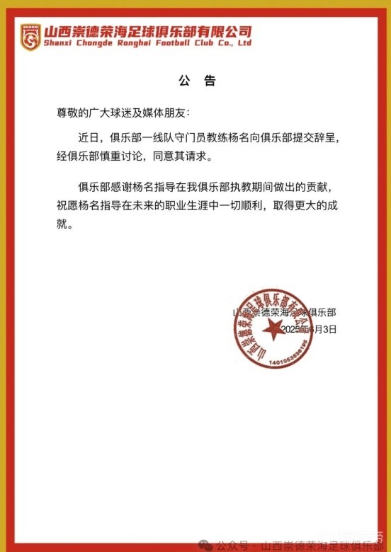 北京时间6月3日晚,中乙山西崇德荣海足球俱乐部发布公告,山西崇德荣海一线队守门员教练杨名提交辞呈,俱乐部已同意其请求。