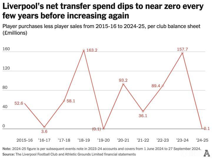 在芬威管理下,利物浦始终谨慎控制转会支出。这更多是出于可持续运营理念而非违规担忧——他们基本没有PSR压力,2024年9月还将循环信贷额度从2亿英镑提升至3.5亿英镑。如有需要,随时可调用资金。