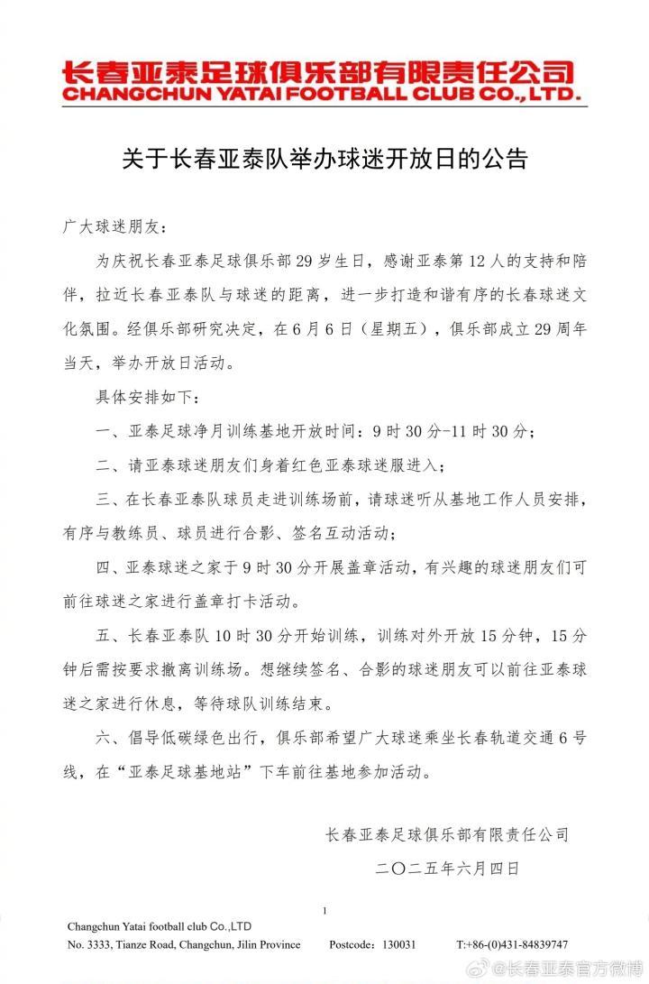 长春亚泰官方发布了举行球迷开放日公告,6月6日,长春亚泰将迎来29岁生日,当天将举行开放日活动。