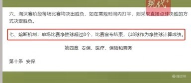 “苏超”联赛打响后,场内场外热度不断飙升。《现代快报》记者注意到,本次“苏超”联赛竞赛规程中设有熔断机制——单场比赛净胜球超过8个,比赛宣布结束,以8球作为净胜球计算成绩。
