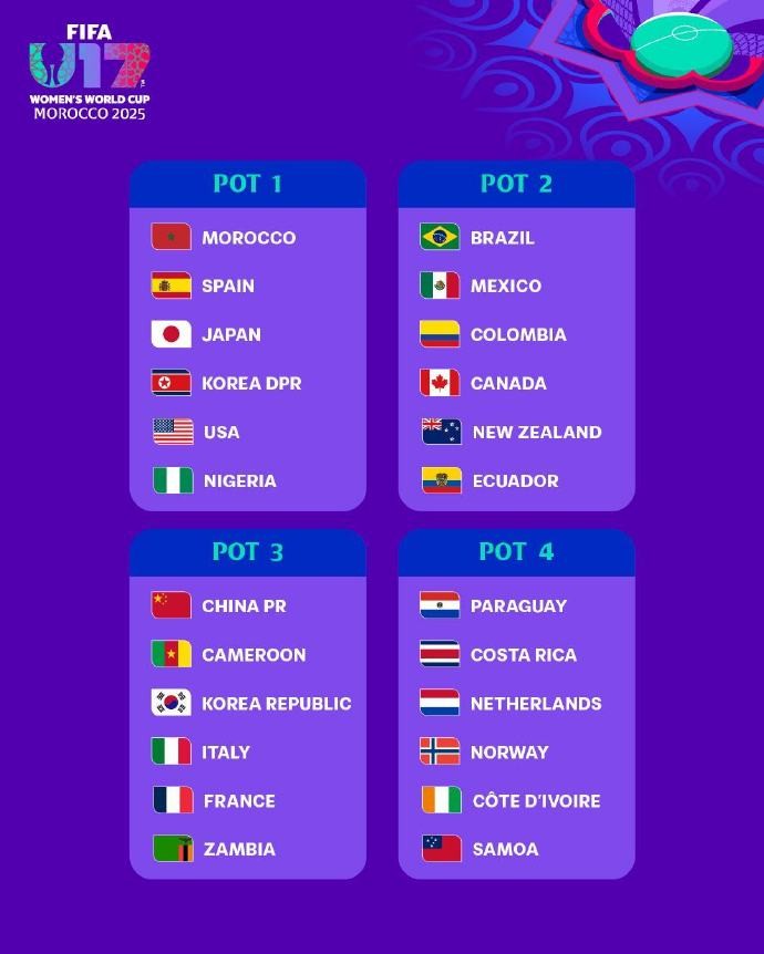 北京时间6月4日,2025年U17女足世界杯抽签分档出炉,其中,中国U17女足被分到了第三档。