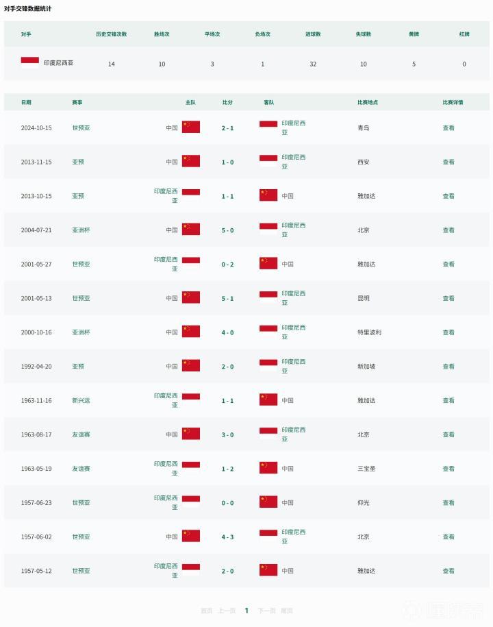 据中国足协官网统计,中国国家队与印度尼西亚国家队在正式比赛中共计交手14次,中国队取得10胜3平1负的成绩,打进32球,丢10球,得到5张黄牌。