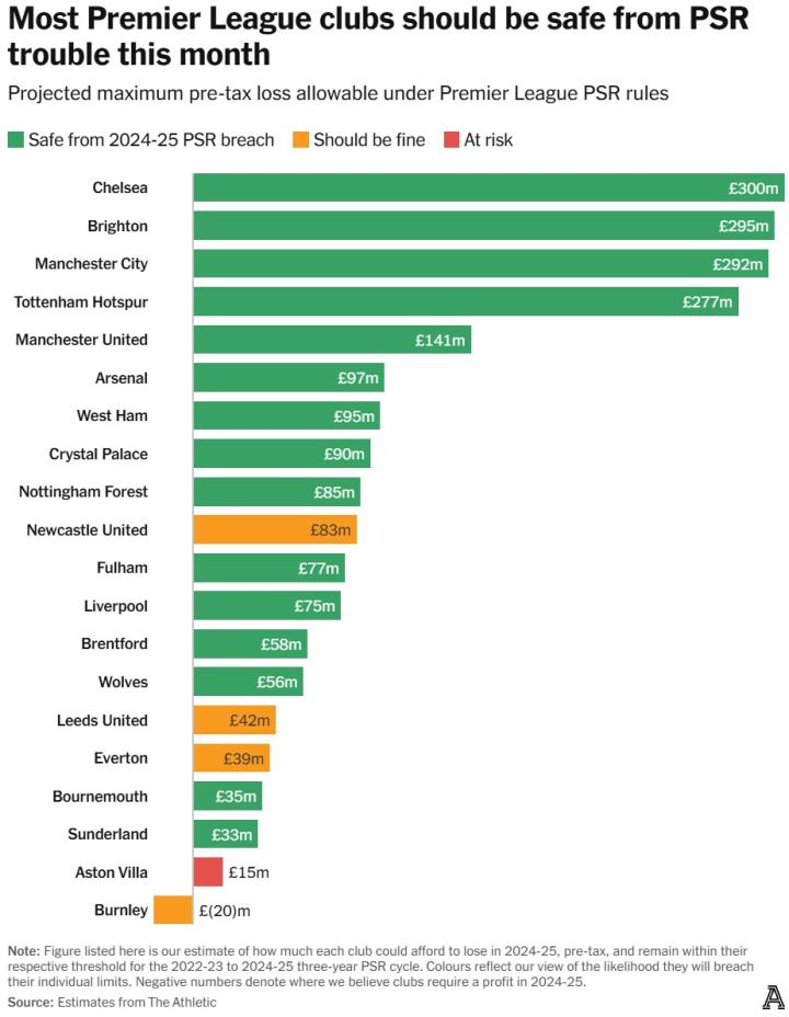 The Athletic基于英超PSR(盈利与可持续发展规则)规则估算各俱乐部2024-25财年可承受的税前亏损额度,以此评估6月30日前是否需紧急交易避违规。数据源自2022-24赛季财报,属非官方测算。