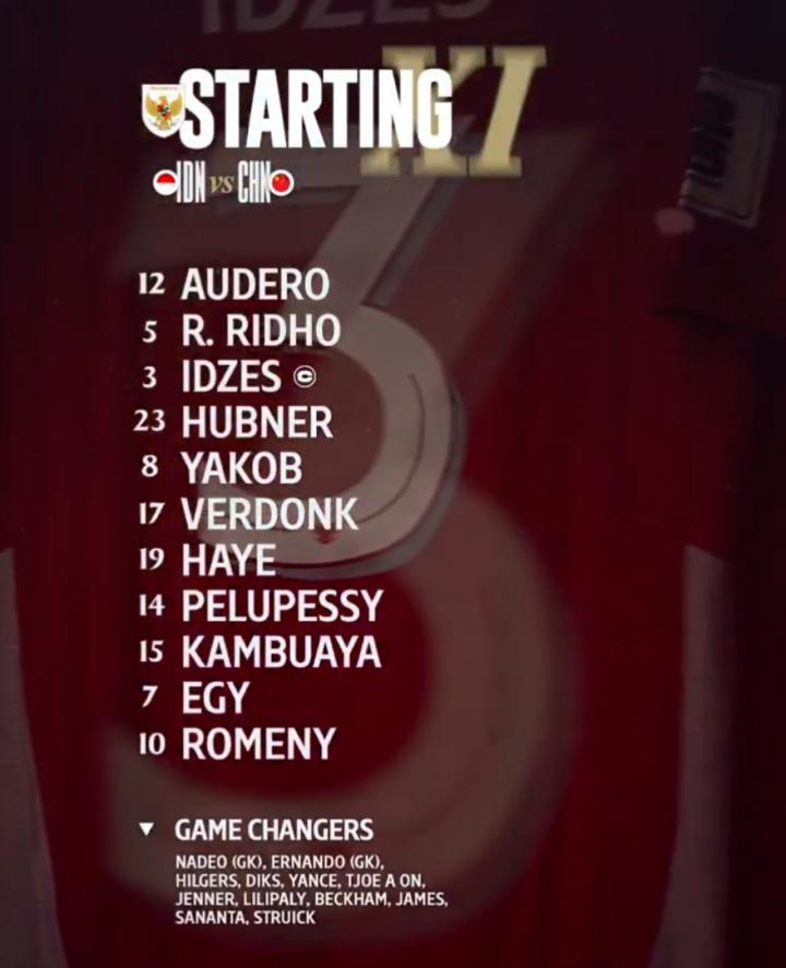 其中印尼首发相较于上一个主场对阵巴林的比赛中更换4人,其中门将佩斯与前卫费迪南因停赛缺席,奥拉特曼戈恩因伤没有入选本期名单,凯文-迪克斯则坐在替补席。