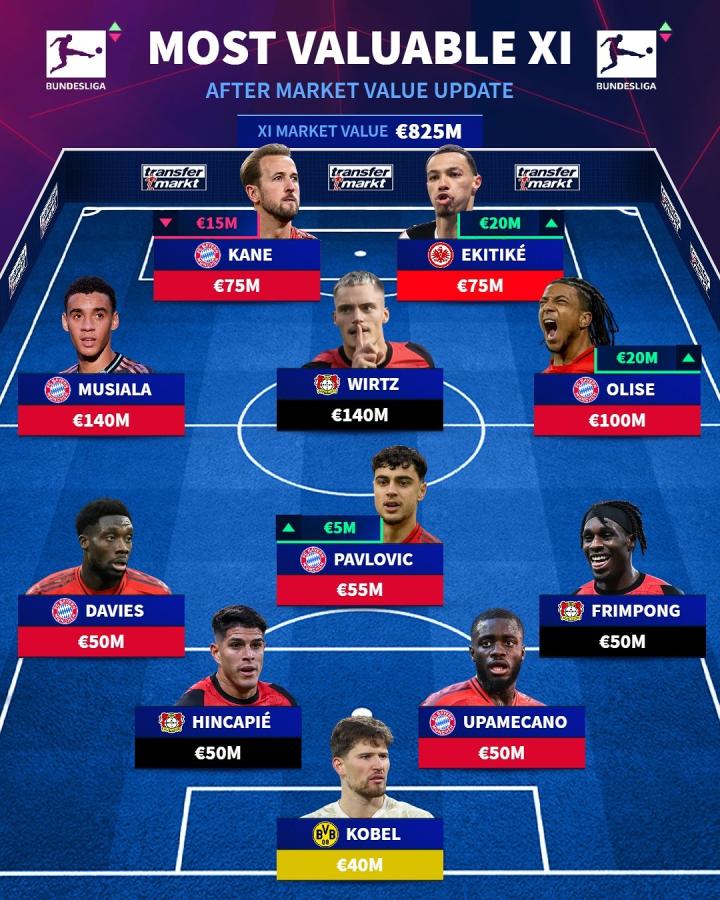 在更新了德甲球员身价后,德国转会市场网站列出了德甲最贵阵容,凯恩领衔6人入选,维尔茨、弗林蓬、埃基蒂克在列。