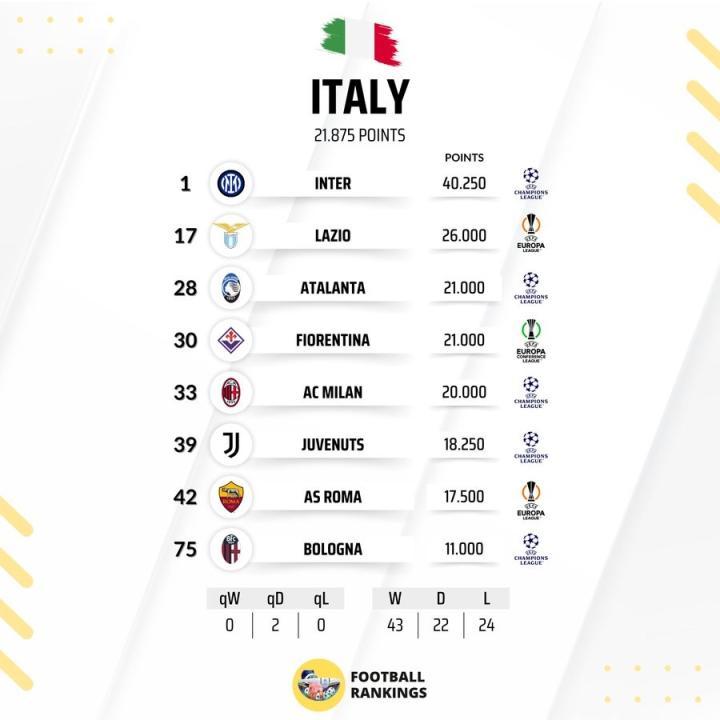 北京时间6月6日,数据机构 Football Rankings 公布了2024/25赛季意大利俱乐部在欧洲赛场的欧战积分排名。国际米兰以40.250分高居欧洲俱乐部榜首,AC米兰排名第33,尤文图斯排名第39。