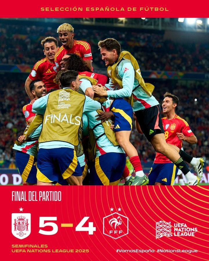 此役对阵法国队,西班牙队曾一度取得5-1领先,但随后连丢三球,最终以5-4的比分取胜,晋级欧国联决赛,将与葡萄牙队争夺冠军。
