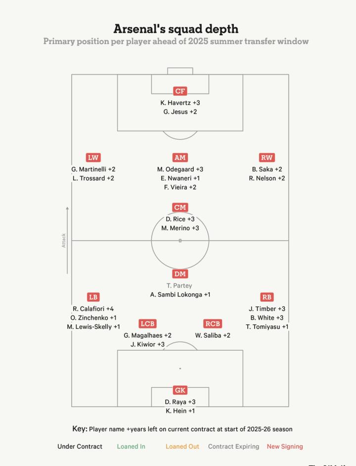 今年夏天,阿森纳的焦点将主要集中在新援引进上——但要想再次冲击冠军,现有球员的调整同样关键。在补强阵容的同时,续约与出售工作对确保平稳过渡至新赛季也至关重要。以下是The Athletic对2025-26赛季阿森纳一线队成员未来前景的全面分析。