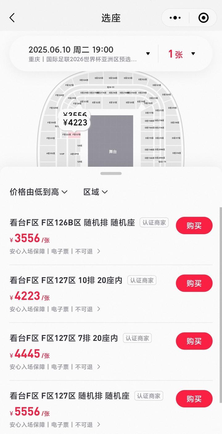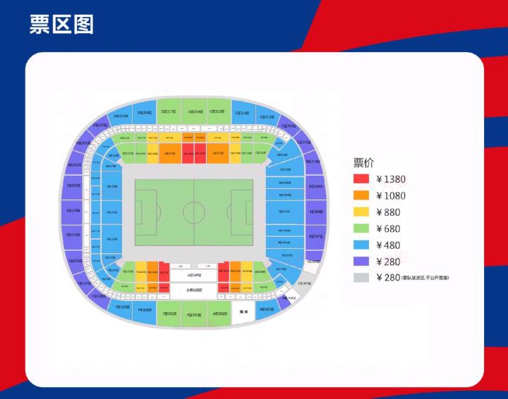 据国足官方售票平台的票区图显示,F区126A区的票价为880元,而F区126B区的票价为1080元,而F区127区的票价则为1380元。