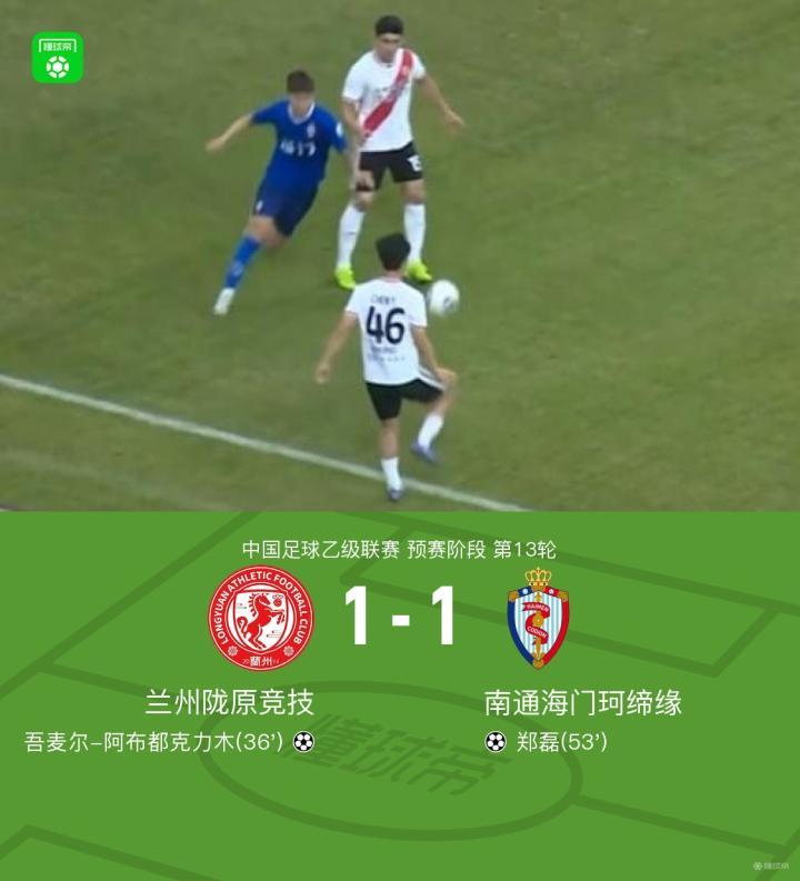 兰州陇原竞技1-1海门珂缔缘,吾麦尔破门,郑磊扳平比分